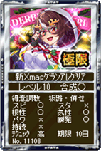 特殊能力 ・併せ調教を行うと、極限突破を行うことができる ・併せ調教で調教効果と同じパラメーターが抽選された場合は極限突破がしやすくなる ・得意調教を行うと、芝適性、ダート適性、重馬場適性が伸びやすくなる ・極限突破確率がアップ(+50%) ・種牡馬カード使用による併せ調教時のアビリティ取得確率がアップ(+30%) ・7日間プレゼントを持ってきてくれます ・プレゼントの中に千夏ブレンド上位版「Xmasターキー」、トナカイ♂♀の上位版「トナカイペア」、極限突破調教カードの上位版がある ・調教するとチャレンジクエスト「Xmasグランアレグリアの追加調教」がまれに発生する。 ・チャレンジクエスト「Xmasグランアレグリアの追加調教」:7パラーメータのいずれか1種が限界突破する。 ※競走馬に設定した次の日からチャレンジクエストが発生します。 |